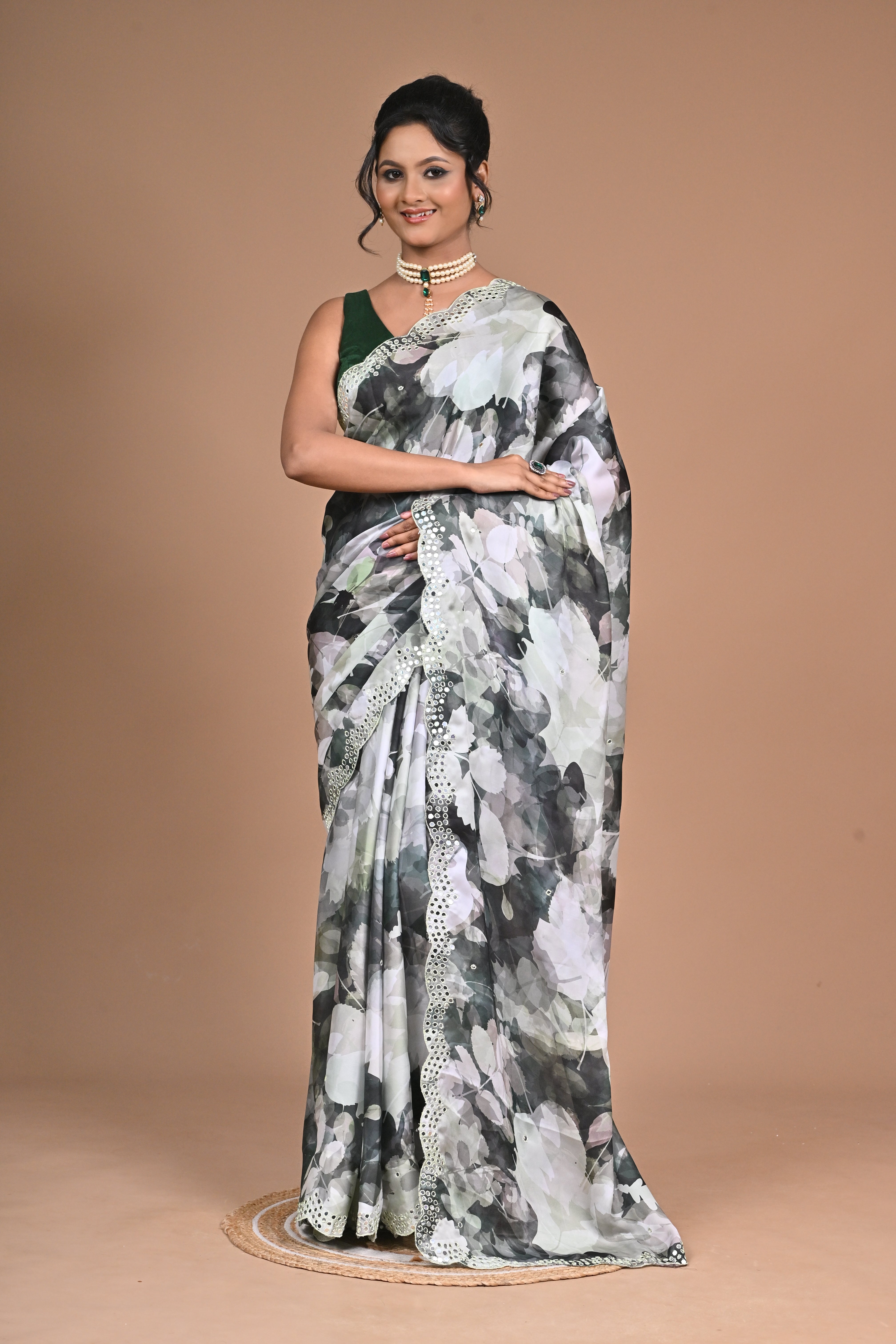 Paired with a contrasting blouse, this saree strikes the perfect balance between sophistication and style. Complete the look with statement jewelry for a glamorous appeal.