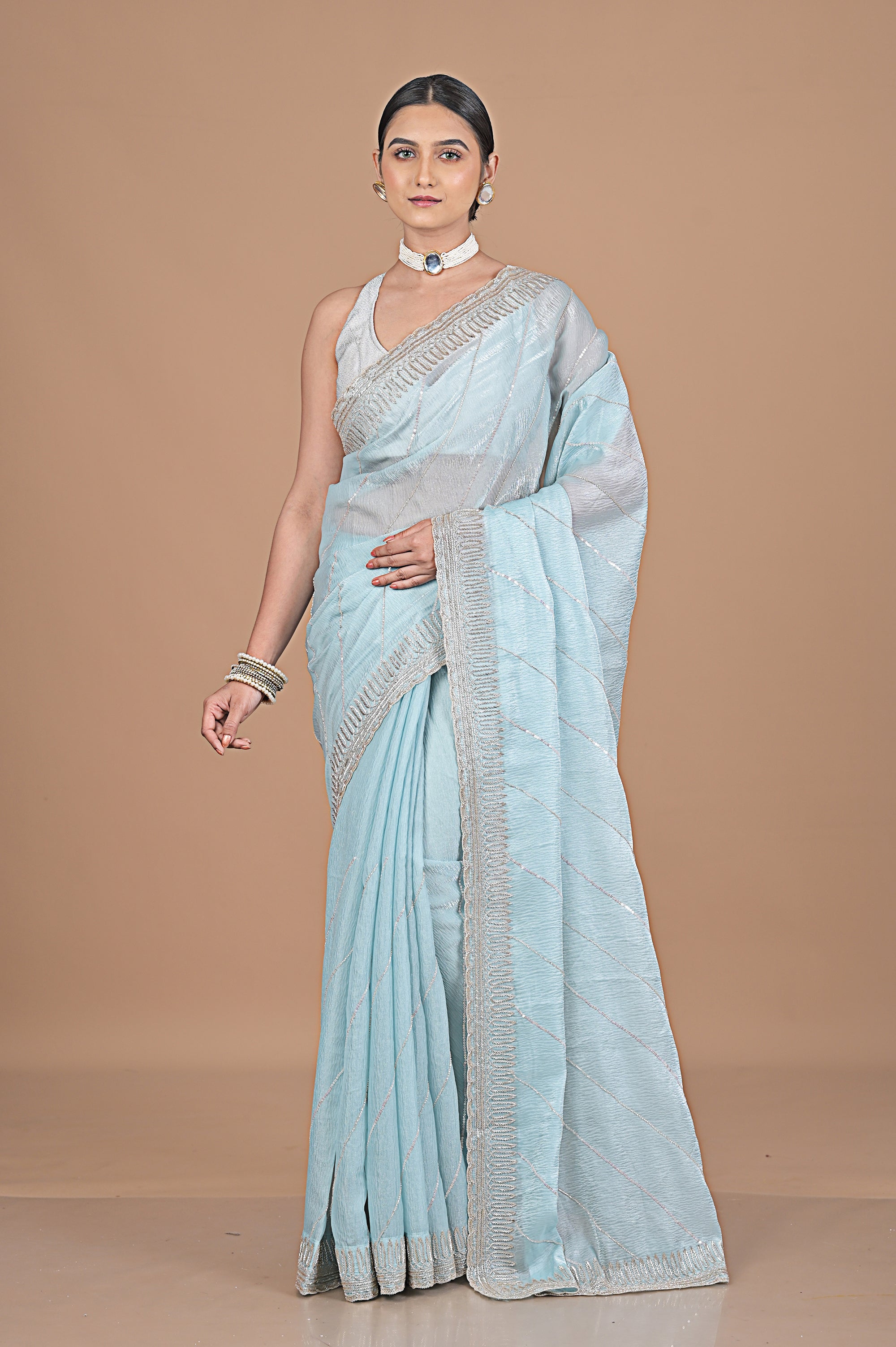Introducing our latest addition, the Glass Tissue saree with delicate cutdana work. This intricately designed saree exudes elegance and luxury, making it a must-have for any special occasion. Crafted from the finest glass tissue fabric, it offers a unique, shimmering texture that will make you stand out in any crowd. Elevate your style with this stunning masterpiece.