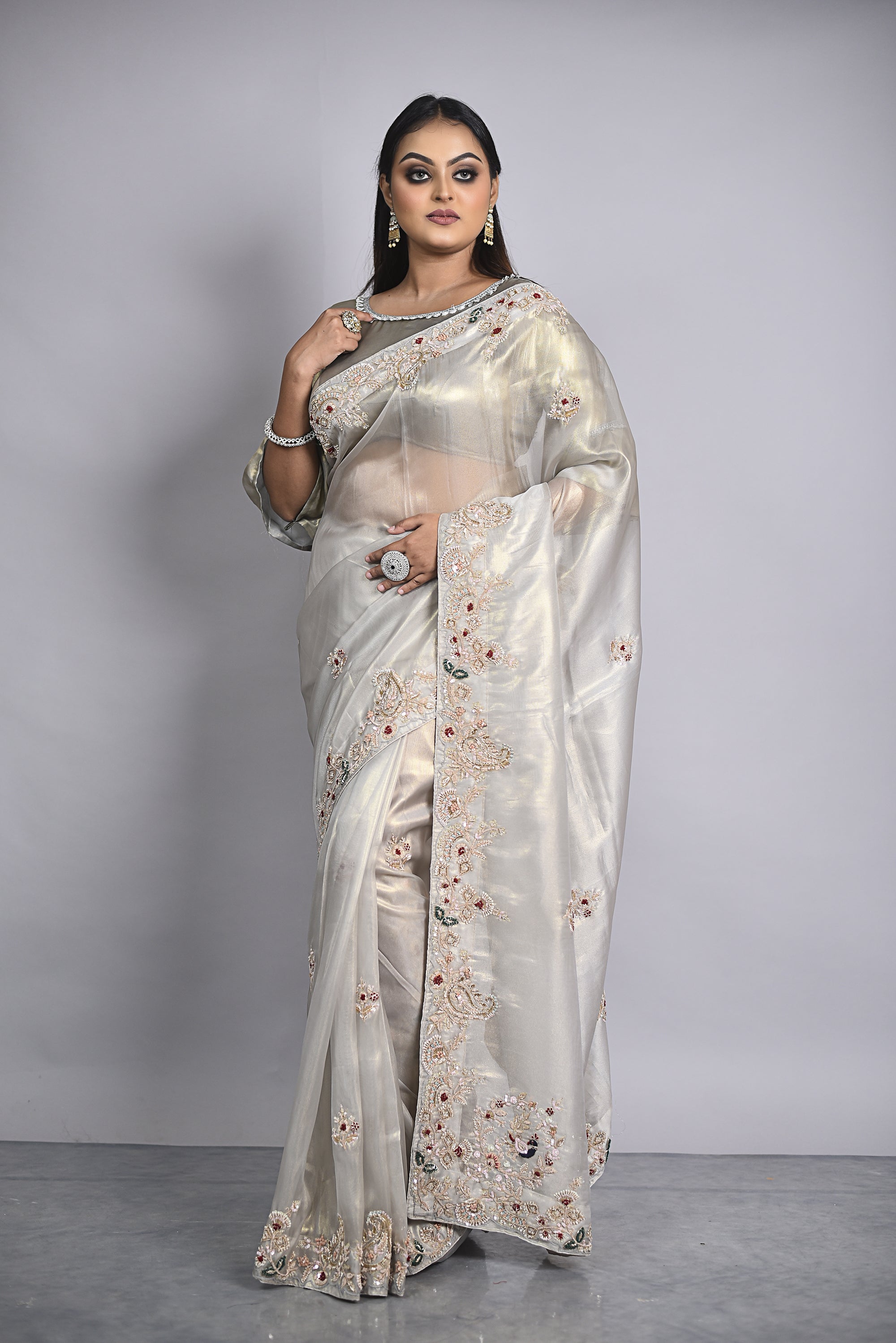 Indulge in luxury and sophistication with our Silver Tissue Saree, featuring a delicate handwork border. The silver fabric shimmers elegantly, creating a stunning statement piece for any occasion. Elevate your wardrobe with our exclusive and timeless design.